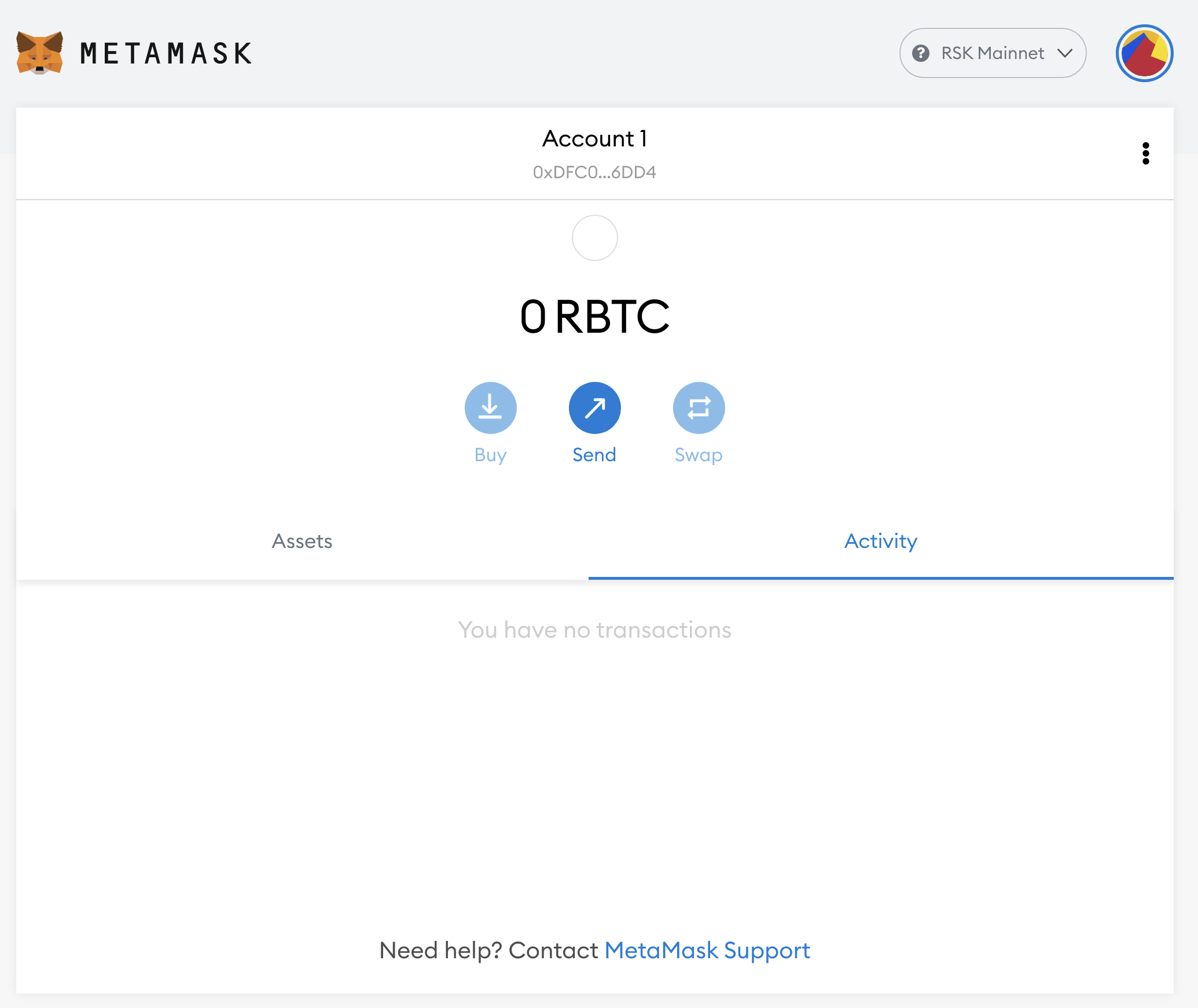 Visit explorer.rsk.co/address/${YOUR_ADDRESS}. Replace ${YOUR_ADDRESS} with the address copied from MetaMask earlier. For example, if you copied 0xdfc0e6361fd1846a223e2d7834a5ebd441a16dd4, the URL will be https://explorer.rsk.co/address/0xdfc0e6361fd1846a223e2d7834a5ebd441a16dd4